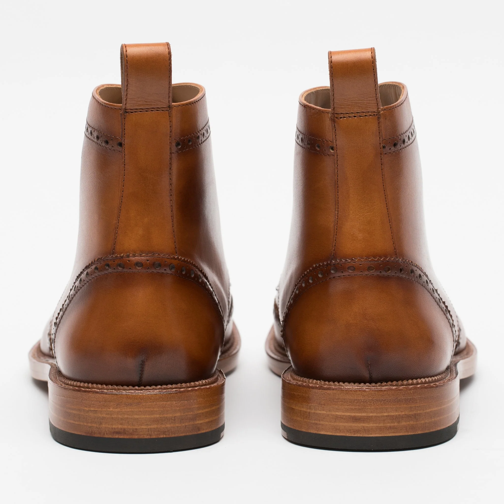 Our Mack Men's Boots in Burnt Honey from TAFT are full brogue, seven-eyelet wingtip combat boots on a stacked leather heel. Featuring full-grain Vachetta natural leather and is hand-painted for a stunning finish.